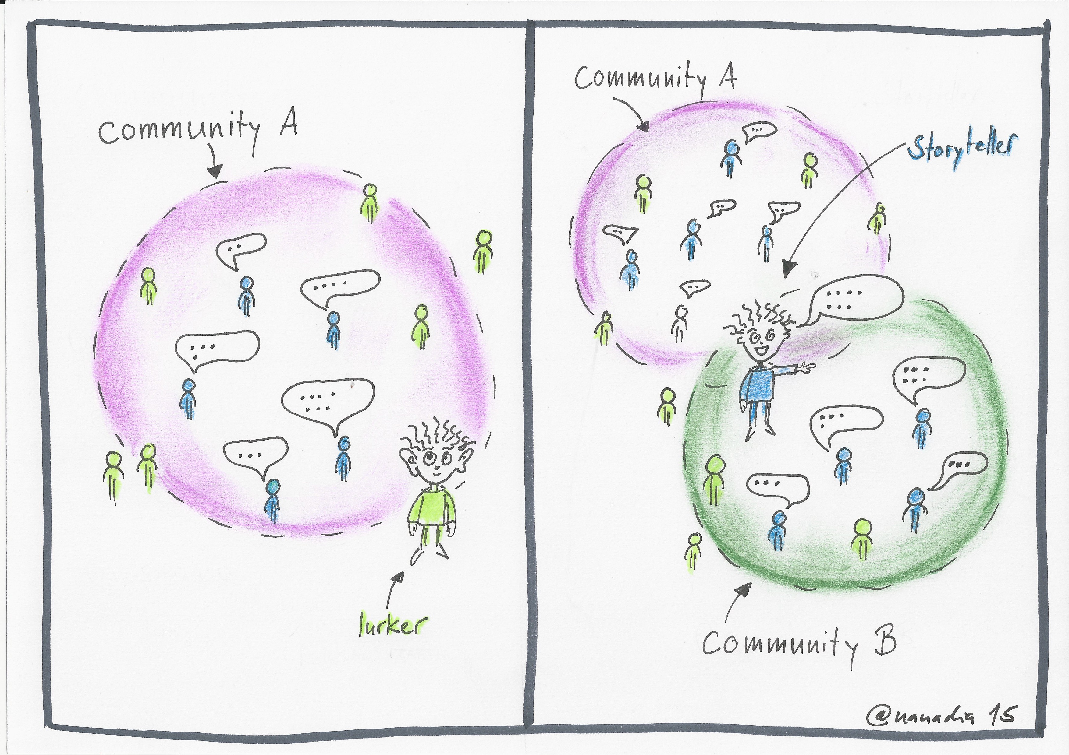 There are two roles to play: a silent one and a visible one. Aren’t we all playing both roles in different situations, moments, in the team, our communities? What we read here, we talk about somewhere else. What we hear in one place we digest elsewhere. The lurker – a funny word indeed – becomes the cross-pollinating bumblebee or the twitter bird.