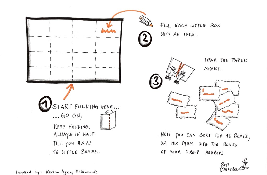 Karten legen (laying cards) by Orbium: It doesn’t have to be a list with bullet-points. Orbium offers a fun-way of list writing. By folding an A4 sheet of paper in half and again in half till we have 16 little boxes. In each little box an idea is captured. We tear the paper apart and can easily arrange the 16 boxes and mix them with boxes of colleagues.