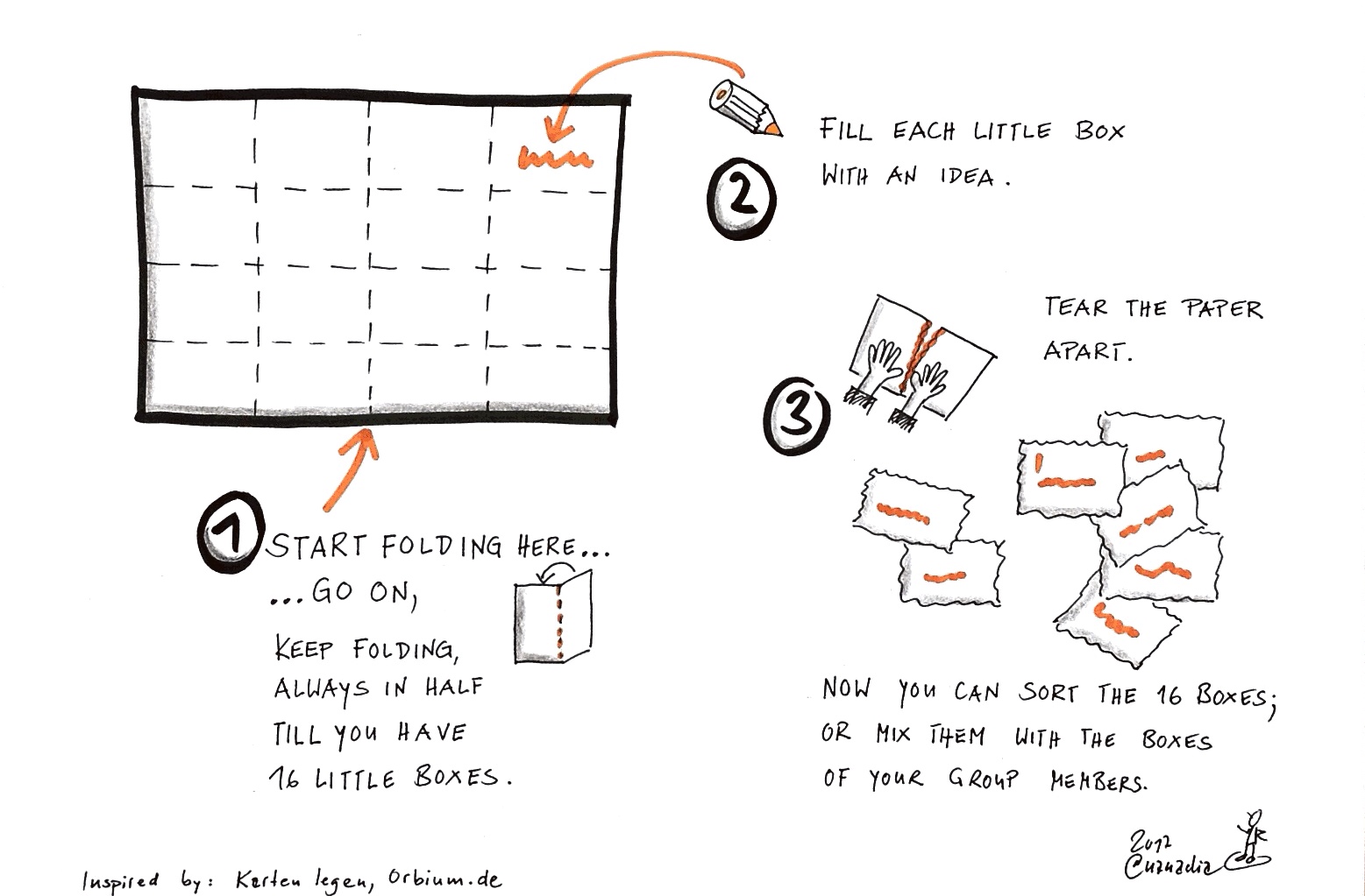 Karten legen (laying cards) by Orbium: It doesn’t have to be a list with bullet-points. Orbium offers a fun-way of list writing. By folding an A4 sheet of paper in half and again in half till we have 16 little boxes. In each little box an idea is captured. We tear the paper apart and can easily arrange the 16 boxes and mix them with boxes of colleagues.