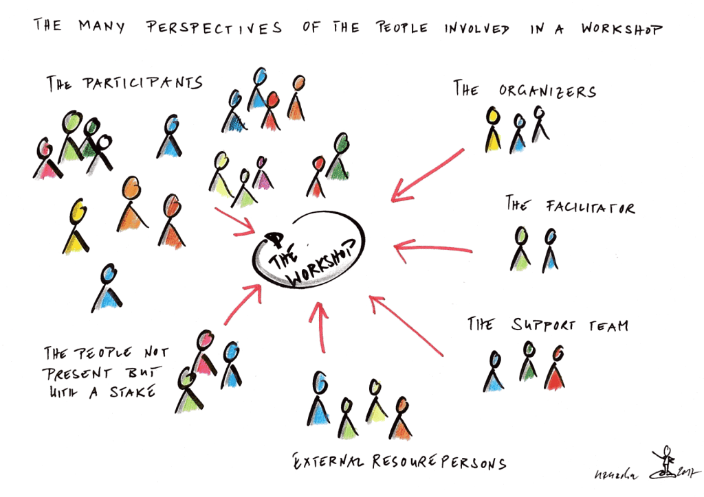 It needs a team to grasp the different perspectives of the people involved. People bring their questions, needs and challenges to the table. They might have interesting solutions, ideas, experiences and know-how to share. They also carry with them their assumptions and beliefs about the way we learn and conduct workshops together.