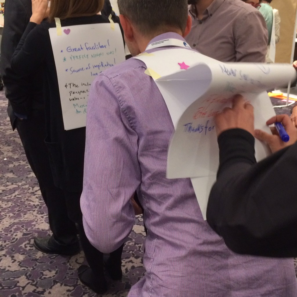 Feedback on your back: As with the Kudo cards feedback is given to each other; in this version everyone gets a flip over paper attached on their back.