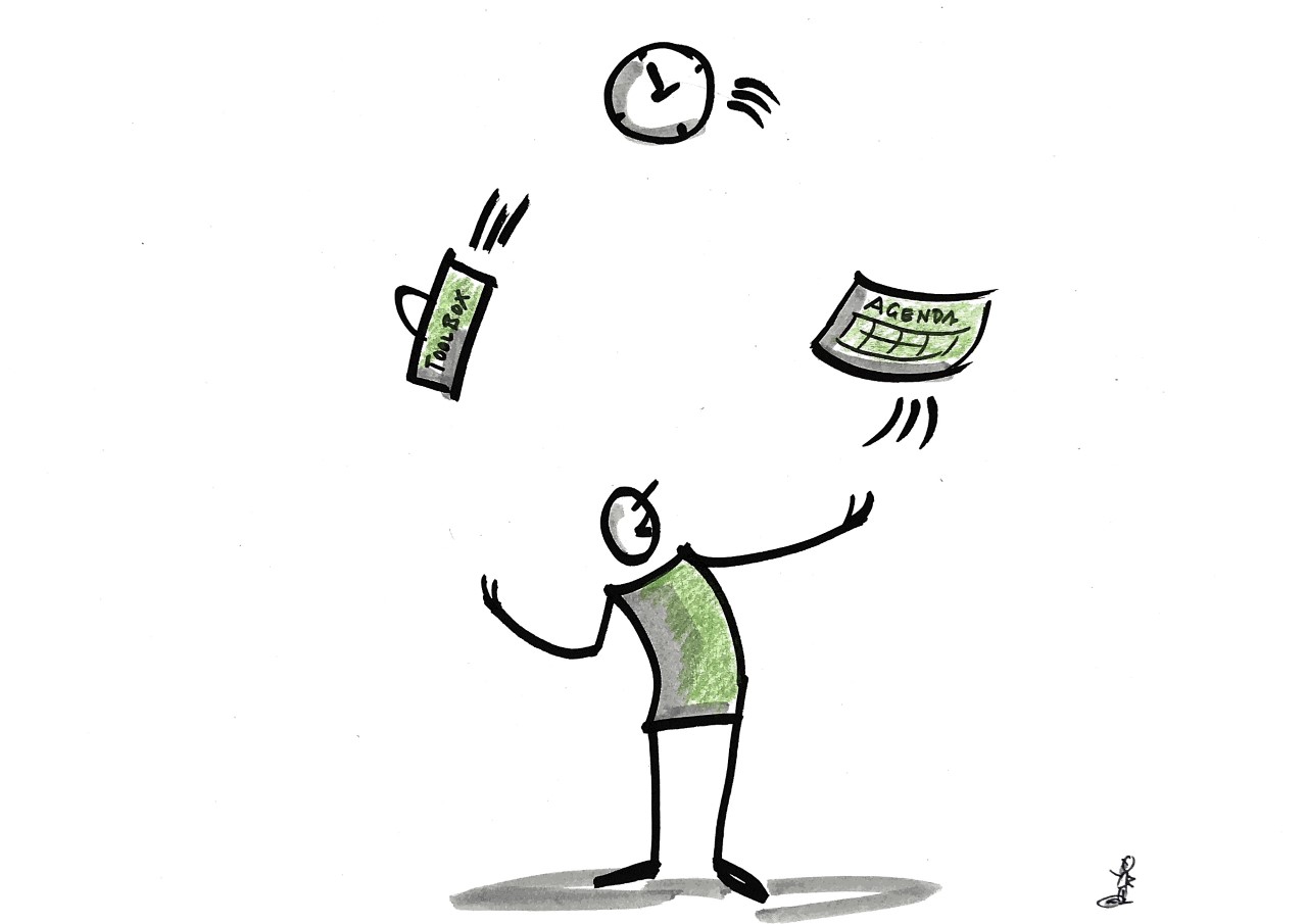 People who are stepping for the first time into the role of the facilitator are keen to have a toolbox. They see the facilitator as magician pulling the right method at the right moment. Sure, a toolbox is handy; though not enough and not the most important element in becoming a facilitator. It is a little bit like a carpenter equipped with a fantastic toolbox. But without an eye for shapes, sizes and details, a strong problem-solving orientation, manual, math and communication skills as well some physical strength and practice, it will be difficult to build a perfect wooden house.