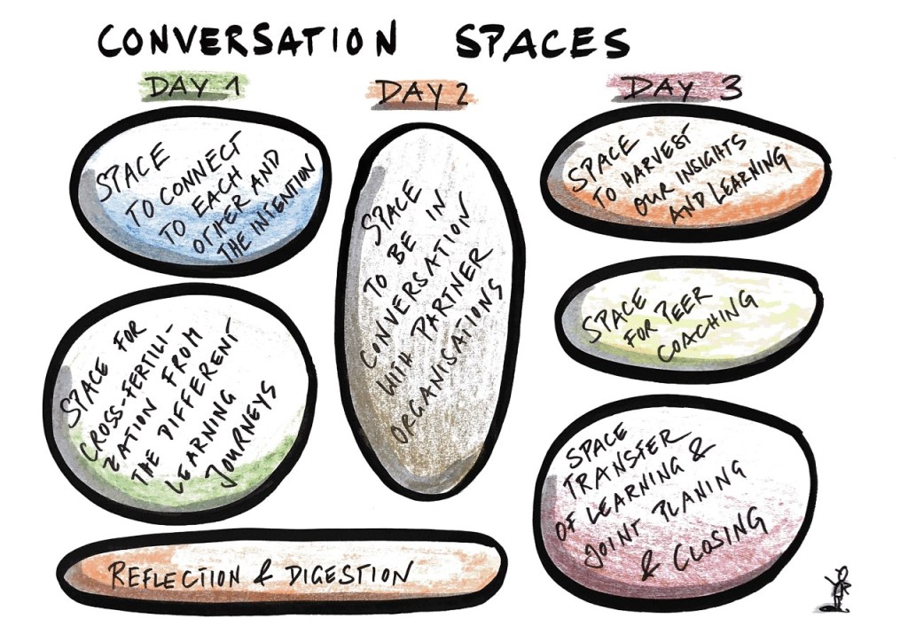 On a large piece of paper, we were drawing conversation spaces. We drew a big circle for the peer exchange on the morning of the first day. We gave the first slot to the network members to share novel knowledge and know how, to connect to each other and get inspired. We drew another big circle in the afternoon for harvesting the leaning journeys. Day two was dedicated to partners with whom conversations could be held (we want to avoid by all means death by PowerPoint). Day three was used as harvesting, coaching and planning space.