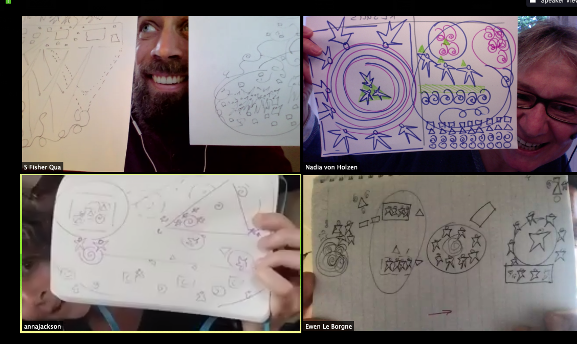 I love drawing in an online workshop. It gives some quiet reflection time, away from the screen. The drawings are easy to share, just hold them in front of the webcam. Or take a photo and share it through WhatsApp or other channels. There are no limitations on when and where to draw.
