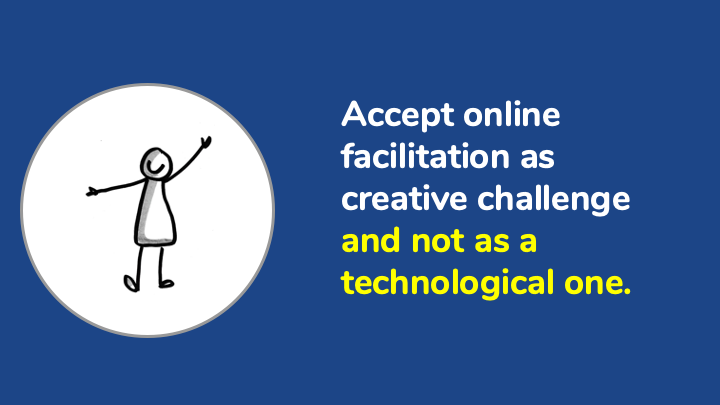 Let’s bring the good from the face-to-face world online, make it even better and bring the discoveries back to the face-to-face events. As leaders and facilitators, we have to adapt our practice to the online environment with its constraints and opportunities. And this means working with and often around technology. This is a creative challenge! I often ask myself: What would I do now in a physical room, and how could I do it online with paper and pen? How can I bring movement, silence, and deep listening online.
