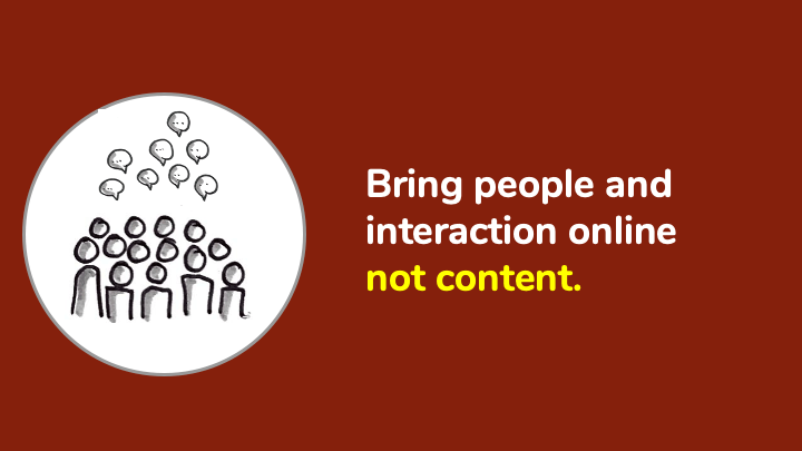 People interact not content. It is as simple as that, therefore we need to bring people online and plan for interaction. This is obvious or at least it should be. And if not, we seriously have to question ourselves: Do we really want to invite people to participate in a live online event for pushing information to them? This is not very efficient, there are other and better means and more appropriate channels (well crafted email, podcasts, video message, animation, ebook).