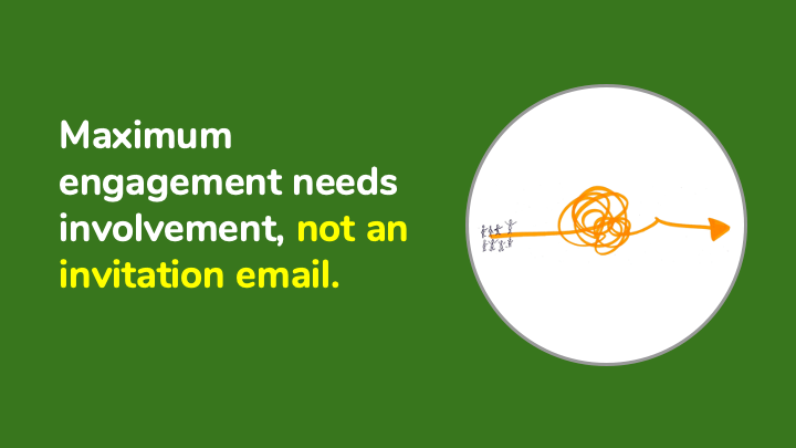 Engaging the community needs more than an invitation email. Invitation is a process (as in physical f2f collaboration). This one comes from Chris Corrigan, and sticks with me as one of my guiding mantras: Engaging and involving are the two sides of the participatory coin.