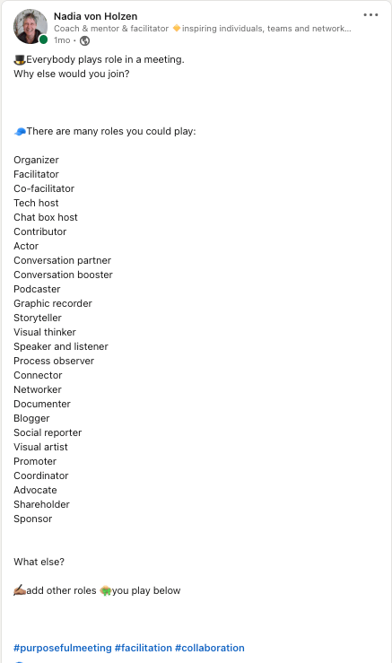 Engage & keep engagement high. on June 9th from 13:30 – 15:30 CEST. Explore with us and a group of peers what facilitating engagement means in practice. How do you create and maintain engagement? How can you be engaging without becoming the meeting clown?