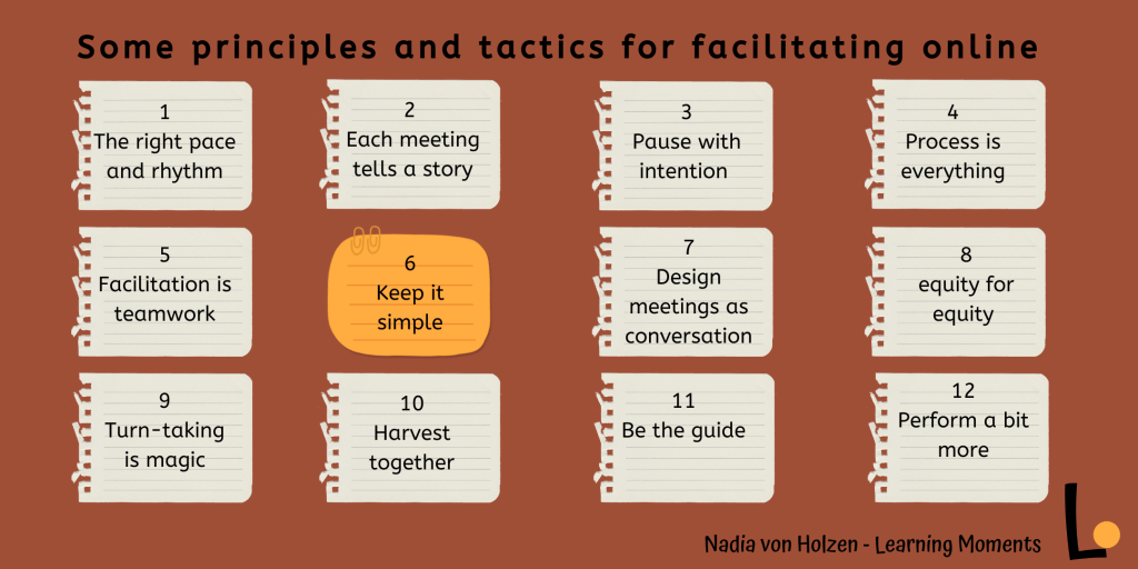 Over the past years, I have developed some principles and tactics that guide my online facilitation. Now and then I love to see what is emerging and make sense of my own ‘learning journey’. I am grateful to many sparring partners who accompanied me along this journey and who helped me notice and refine my art of facilitation.