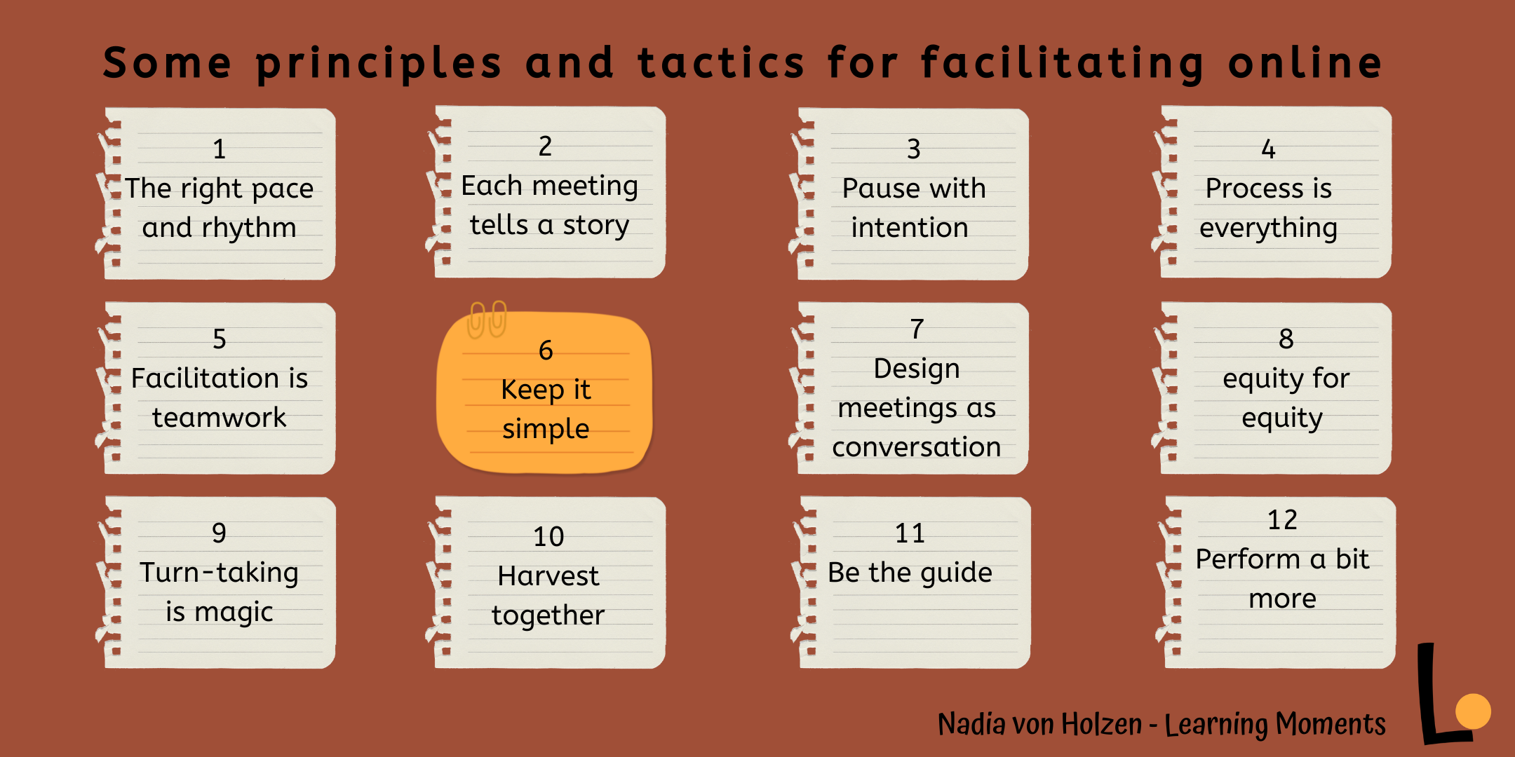 Each online meeting has its own pace and rhythm. Fast enough to keep everyone’s attention. Slow enough to think deeply together and explore an issue beyond the obvious. The pace needs to be right and adapted to the challenge at hand.