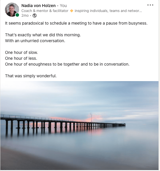 I pressed ‘Join’ on my screen. Quite quickly I tuned into the rhythm of the conversation listening to what was shared. I remember grabbing the talking piece several times to add my thoughts. Our conversation was around the wicked questions of our busy time, the attention economy and the art of facilitating connections. It was once again a free-flowing thinking process weaving meandering discussion threads together. I left inspired and energized and posted this on LinkedIn. The post got quite a bit of attention. It seems my words resonated.