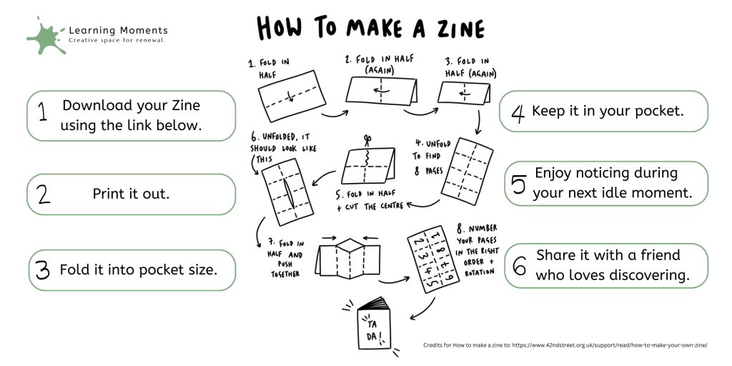 If you’re up for it, I invite you to join me in this practice of noticing. Here’s a tiny booklet for you: a Zine (a self-published, small-circulation booklet created with a DIY—Do It Yourself—spirit). Print it out, fold it according to the instructions in the photo, and it’ll fit perfectly in your pocket—ready to accompany you during quiet moments of reflection.
