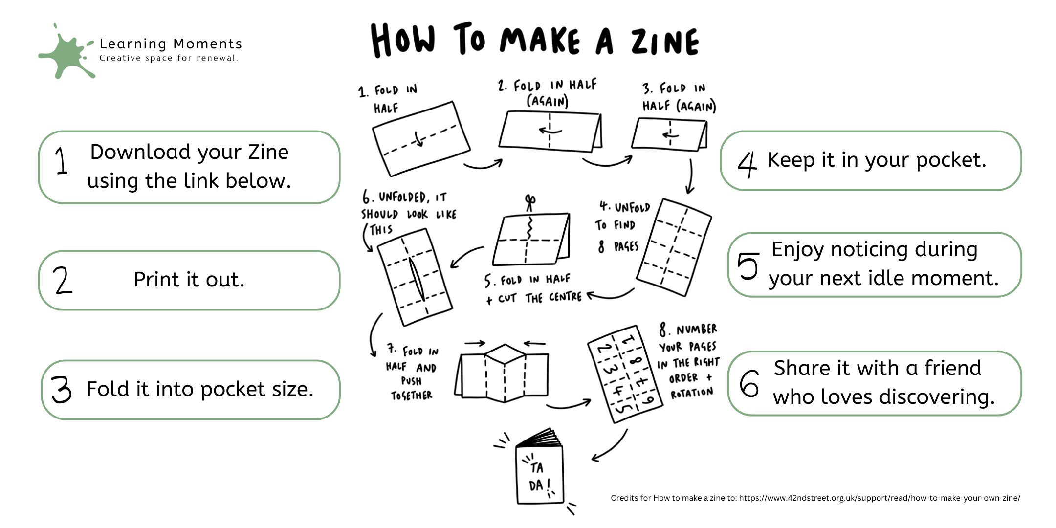 If you’re up for it, I invite you to join me in this practice of noticing. Here’s a tiny booklet for you: a Zine (a self-published, small-circulation booklet created with a DIY—Do It Yourself—spirit). Print it out, fold it according to the instructions in the photo, and it’ll fit perfectly in your pocket—ready to accompany you during quiet moments of reflection.